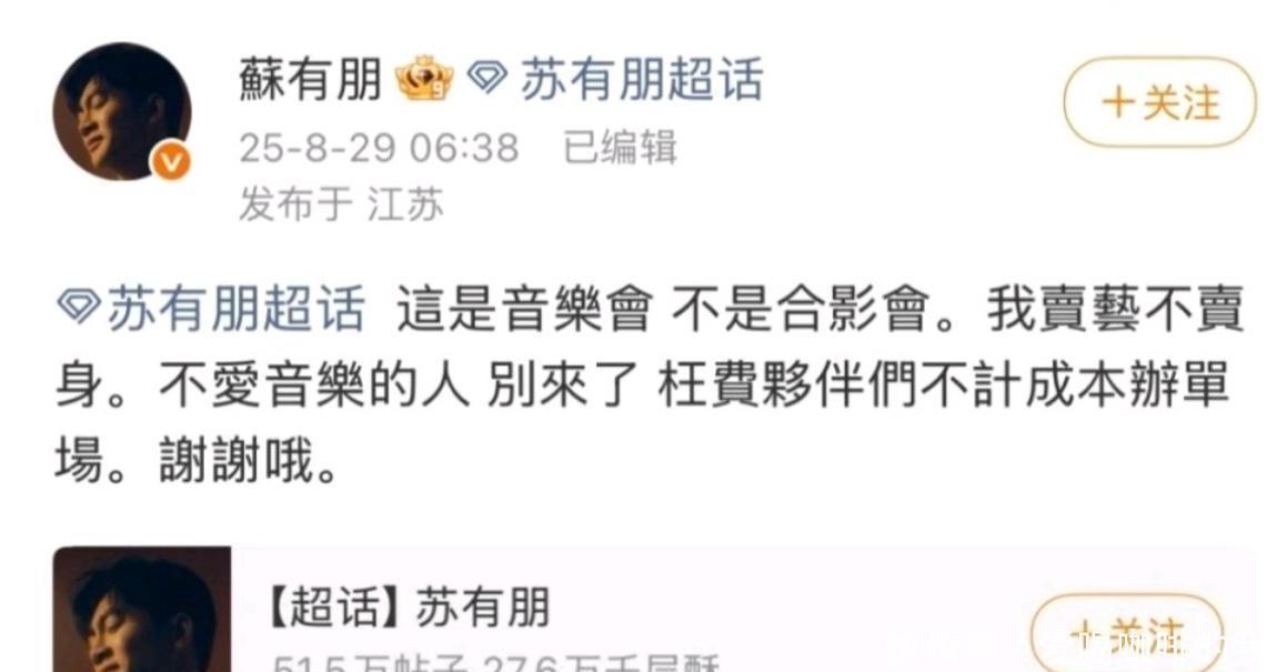 本应是粉丝与偶像的双向雷同,可苏有一又的恢复却让东说念主大跌眼镜——他径直在外交平台发文:“我卖艺不卖身。”并补充:“这是音乐会,不是合影会,不爱音乐的别来了。”